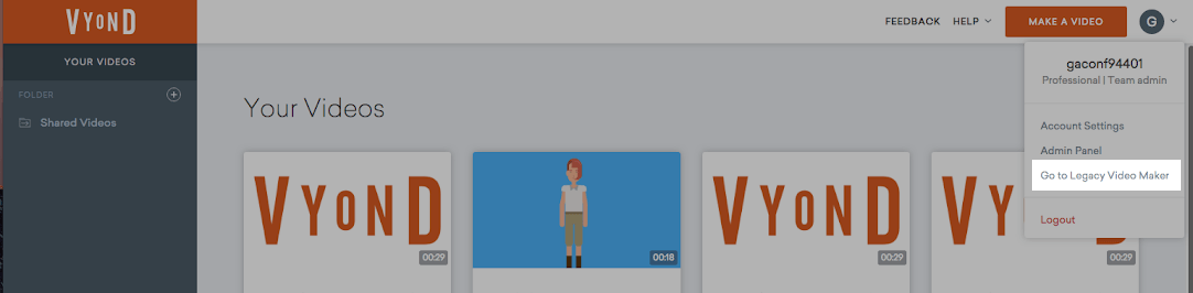Switching From Legacy Video Maker to Vyond Studio By Amanda Morgan on October 29, 2018The new Vyond StudioIn May 2018 GoAnimate rebranded to Vyond and simultaneously released the beta of a new video-making experience: Vyond Studio.The new Vyond Studio is faster, easier to use, and includes a new animation style. We’re excited about the improved preview experience, keyboard shortcuts, a new timeline, and much more. Why make the switchThe legacy video maker was built using Adobe Flash. While Flash used to be the standard application for running multimedia content, it’s become outdated as other technologies—such as HTML5—have emerged as faster, more secure solutions. We have HTML5 to thank for the latest improvements and for what’s to come in the future. Since Flash will cease to exist by 2020, so will our original, legacy, video maker. We encourage you to make the switch from the legacy video maker to Vyond Studio in the meantime. Vyond Studio is now our flagship platform, and we make continuous improvements each week. Find the latest updates here. Please note that if Flash is disabled in your browser settings, the legacy video maker will not work properly and you may experience errors.There is no cost to switch from the legacy video maker to Vyond Studio.Change your default experienceAnyone who became a customer prior to May 6, 2018 needs to manually switch their default experience from legacy to Vyond Studio. Anyone who started a free trial or became a Vyond customer after May 6th already has Vyond Studio set as their default experience. Here’s how to change your default video-making experience:1) Click on Account Settings.2) Click on Default Experience. 3) Select the preferred experience and click Update.After making this change you will still be able to switch back to the legacy video maker. Migrating legacy assetsWhen you switch to Vyond Studio, your previously created custom characters and imported assets will be automatically available. You can now delete your duplicate characters and assets too!Videos created on their respective platforms are non-transferrable – this means a video created in legacy cannot be transferred or moved to Vyond Studio, or vice versa. At this stage, there is no way to migrate videos or scenes from legacy to Vyond Studio. We’re actively working on incorporating video migration and want the transition to be as smooth as possible, and we will share more specifics with you soon.In the meantime, you are still able to switch back and forth between the two platforms to retrieve your original videos. Please see the images below to see where you can change your experience. To do so, simply select the option in the settings drop-down menu in the top right corner of “Your Videos” page.Going from Vyond Studio to the legacy video maker:Going from the legacy video maker to Vyond Studio: